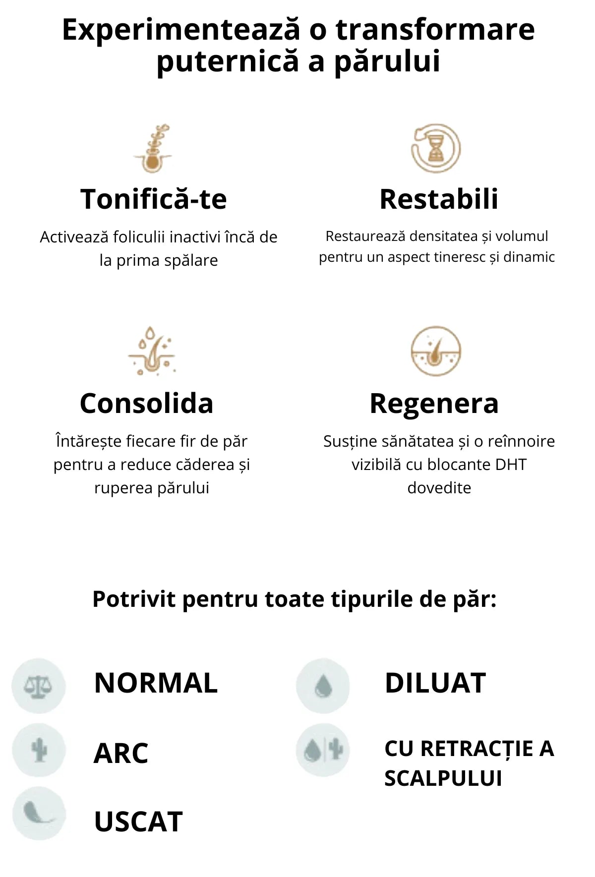 O rutină simplă de 90 de zile (2–4 ori/săptămână) care ajută la combaterea DHT-ului local, stimulează microcirculația și oferă părului un aspect mai des. Rezultatele pot varia.