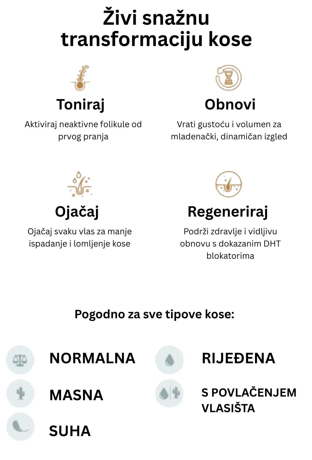 Usmjereno na smanjenje kontinuiranog ispadanja i poboljšanje osjećaja/izgleda vlakana; rezultati ovise o preostalim folikulima. Pravi test traje 90 dana.
