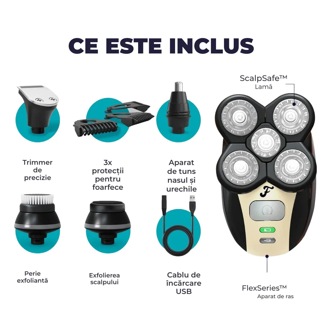 Gama FlexSeries permite un bărbierit fără cuturi sau raune. Tehnologia inovatoare ScalpSafe™ garantează un bărbierit sigur de ecbre dată.