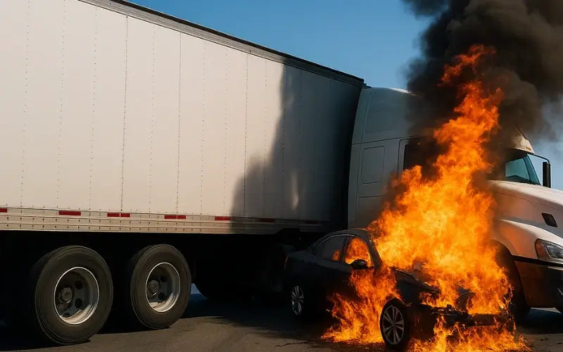 O autocamion de 40 de tone derapează și lovește mașina. Loganul este strivit. Alimentarea electrică cade. Ușile sunt deformate și blocate.